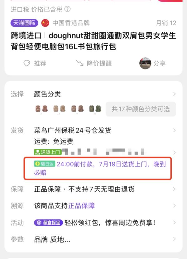 澎湃新闻记者7月17日通过产品详情页也看到,该产品链接在首页用鲜艳的紫色字体显著地标注了“隔日达:24:00前付款,XXX(隔日)送货上门,晚到必赔。”而该链接中有17款颜色的双肩包,其中部分产品点击后下方小字显示隔日达,而有些产品则不属于“隔日达”,但下方并未提示,消费的人在购买时较难识别。