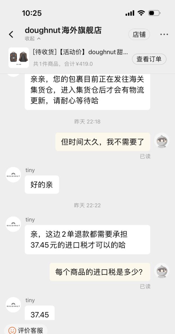 近日,安徽的张女士向澎湃质量观投诉反馈平台反映,她在天猫国际“doughnut海外旗舰店”买了两款双肩包,在购买时看到产品页面显示“隔日达”“晚到必赔”,然而等待4天后,其中一个包包却迟迟未显示物流信息。她向商家申请退款后,被告知需要支付37.45元的“进口税”才同意退款。
